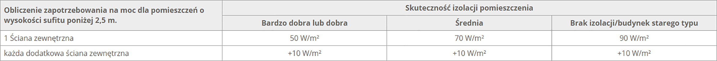 Powierzchnia pomieszczenia w m² x W/m² = zapotrzebowanie na moc cieplną w W.